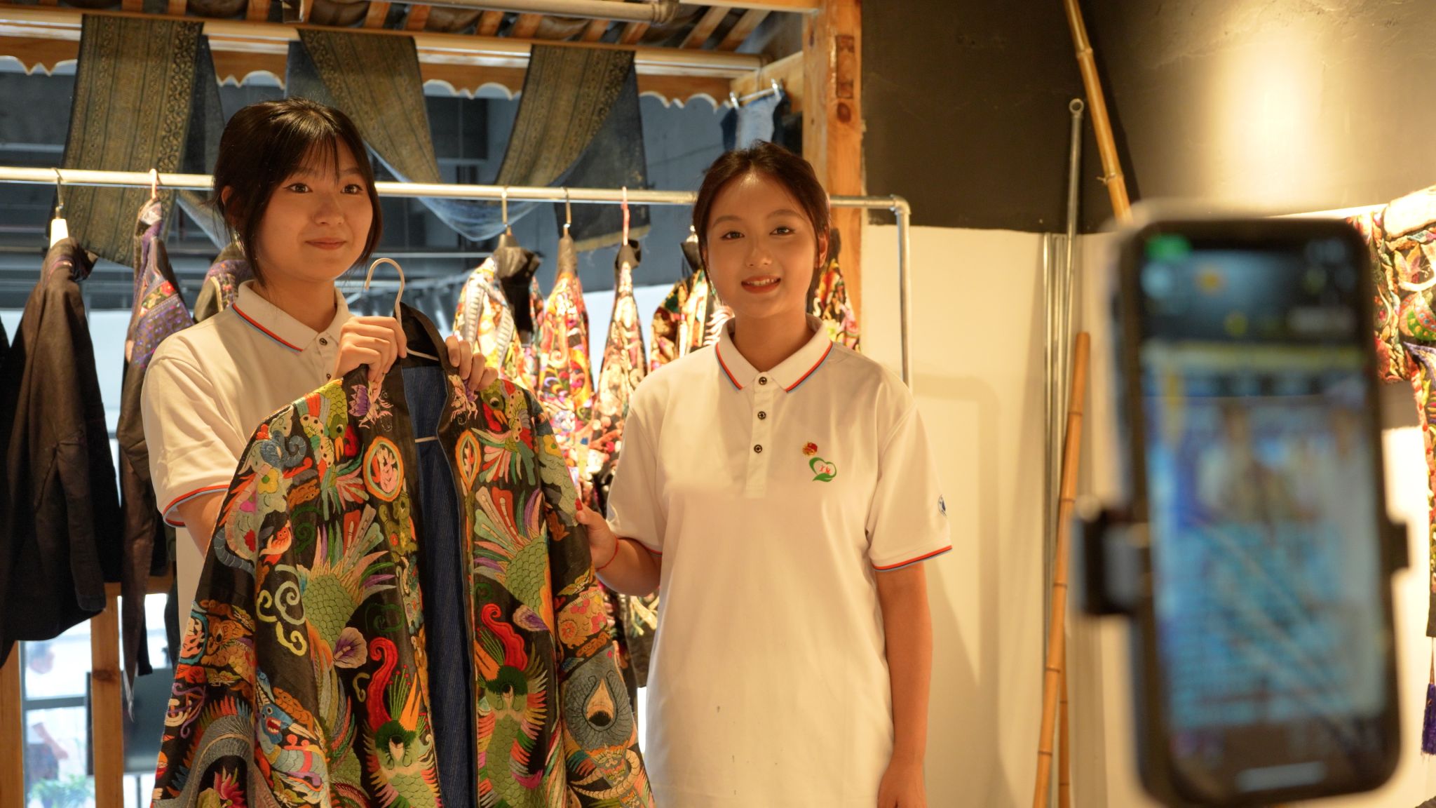 实践团成员在张艳梅老师的带领下动手体验蜡染过程,学习蜡染的精妙技艺。同时,实践团成员深入调研工坊非遗产品类型、创新模式及电商销售模式,并亲身体验苗绣产品线上销售,为工坊产品直播带货,助力苗绣、蜡染工艺品的推广传播。