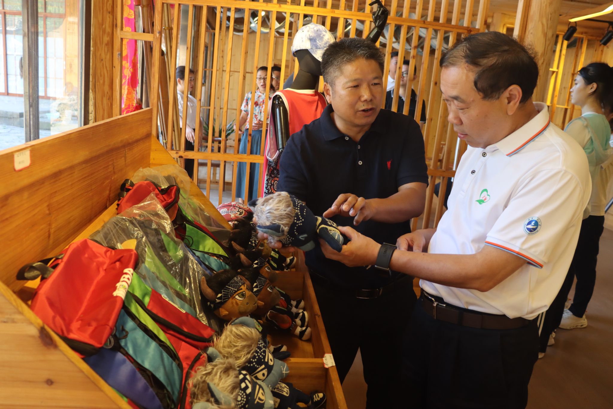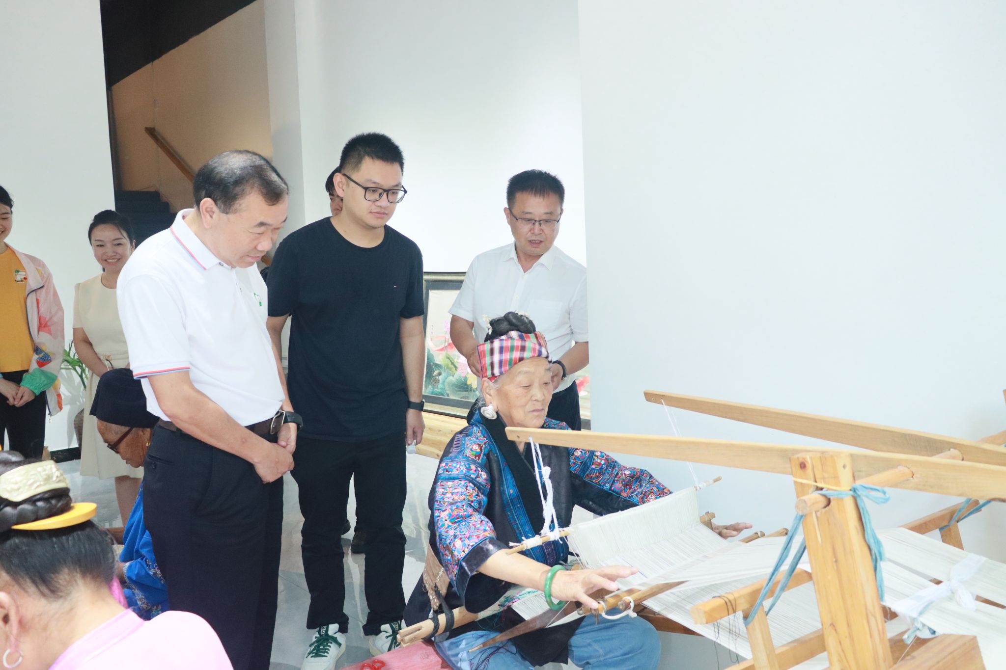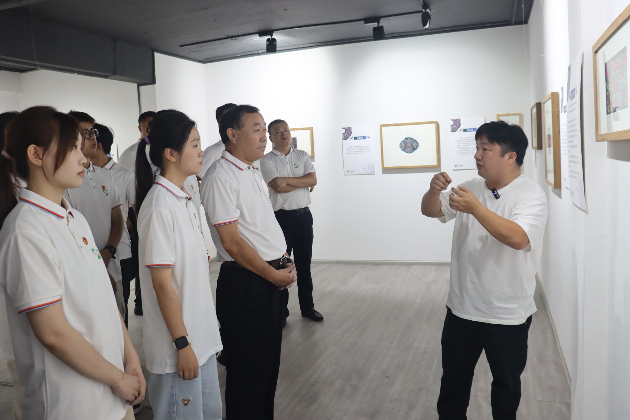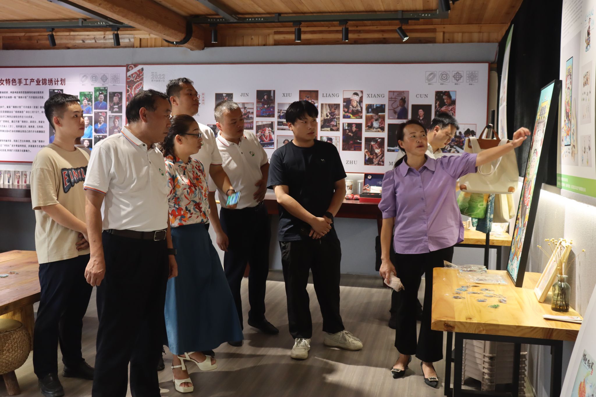 随后,实践团一行来到台江县吉玉鸟苗绣工坊,在工坊负责人王建明的带领下参观苗绣文化展厅,详细了解苗绣的发展历史、技艺种类,近距离感受苗绣文创产品。
