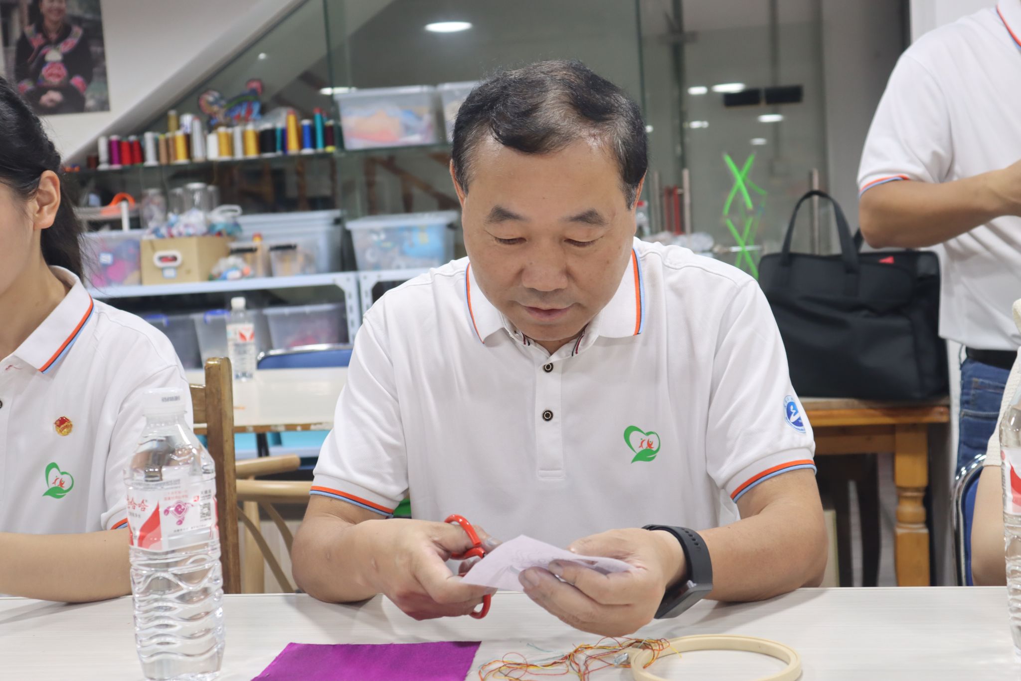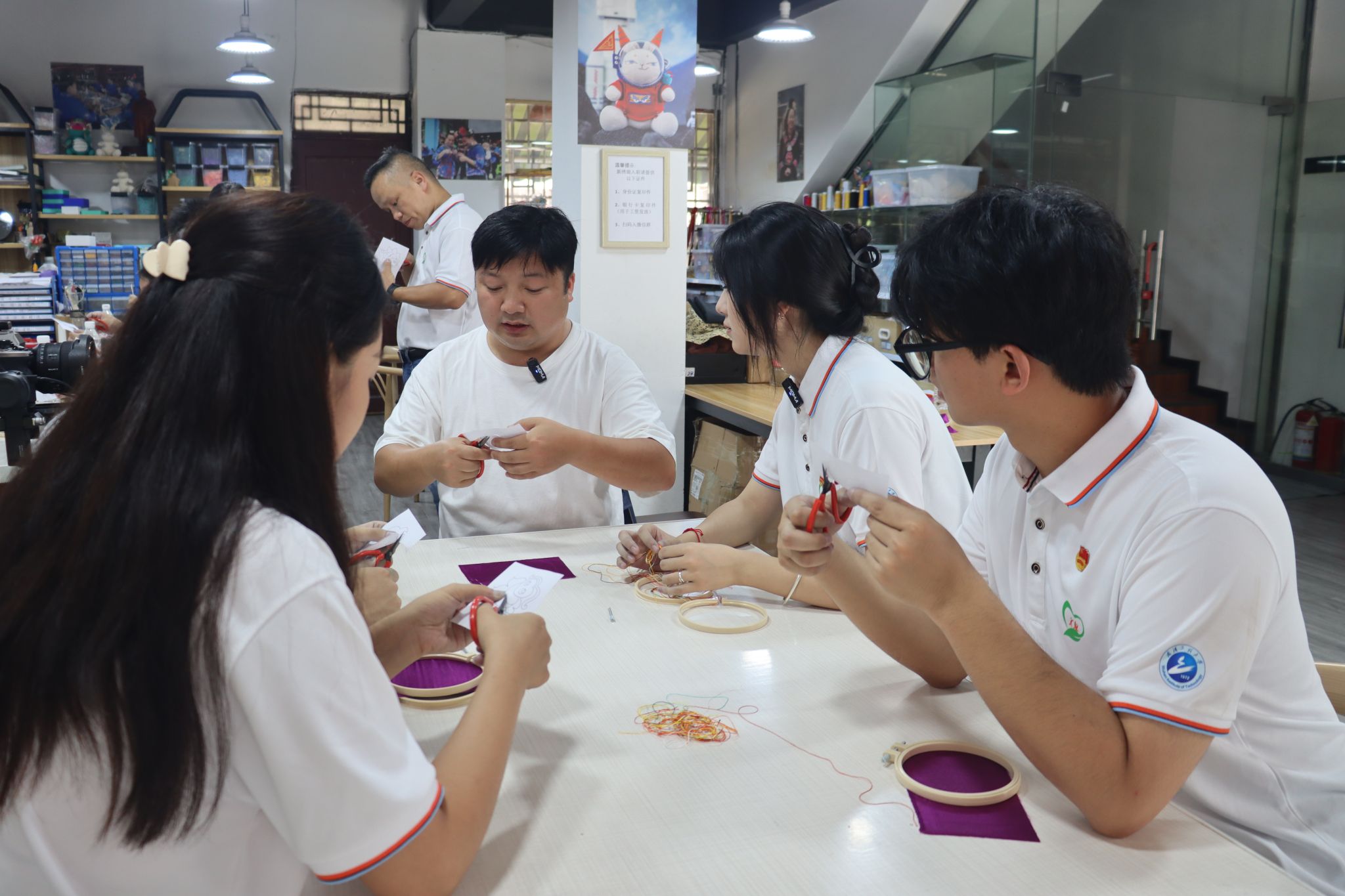 校党委副书记李志旭代表学校为台江县吉玉鸟苗绣工坊授牌。实践团成员在王建明的带领下,亲自动手,学习苗绣剪纸、刺绣技艺,画样、剪样、上绷架、配线、握针、运针、抽针、打结,制作精美的苗绣作品。