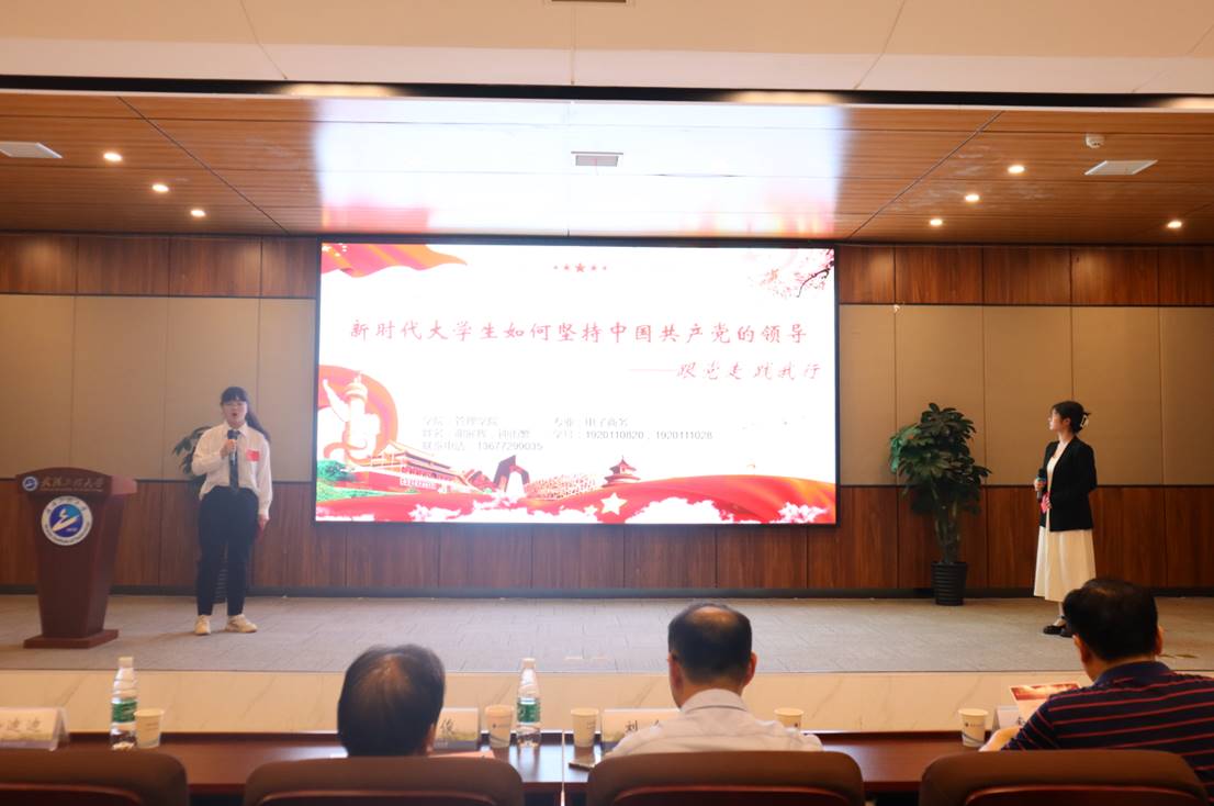 获得二等奖的第一组选手是来自管理学院的谢展辉、钟雨繁、卢瑞,他们演讲的主题是“新时代大学生如何坚持中国共产党的领导”。他们以双人演讲的新形式讲述了中国共产党的领导地位是历史和人民的选择、中国特色社会主义最本质的特征是中国共产党的领导、新时代大学生坚持中国共产党领导的举措。