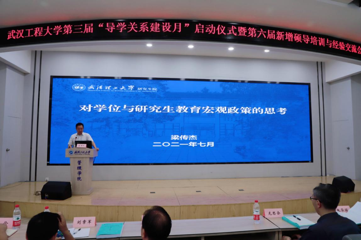 本网讯(通讯员 郑新霞)为进一步深入学习贯彻习近平总书记关于教育的重要论述、全国教育大会、全国高校思想政治工作会议和全国研究生教育会议精神,推动学校研究生教育高质量发展。7月2日上午,学校第三届“导学关系建设月”启动仪式暨第六届新增硕导培训与经验交流会在流芳校区文科楼413隆重举行。武汉理工大学研究生院院长梁传杰,研究生院副院长熊伦、党委研工部副部长、研究生院副院长陈俊、研究生院副院长杨述斌、各研究生培养单位党委副书记、分管研究生工作副院长,新增硕导、研究生培养秘书及研究生辅导员、研究生院相关人员出席了会议。会议由研究生院副院长熊伦主持。