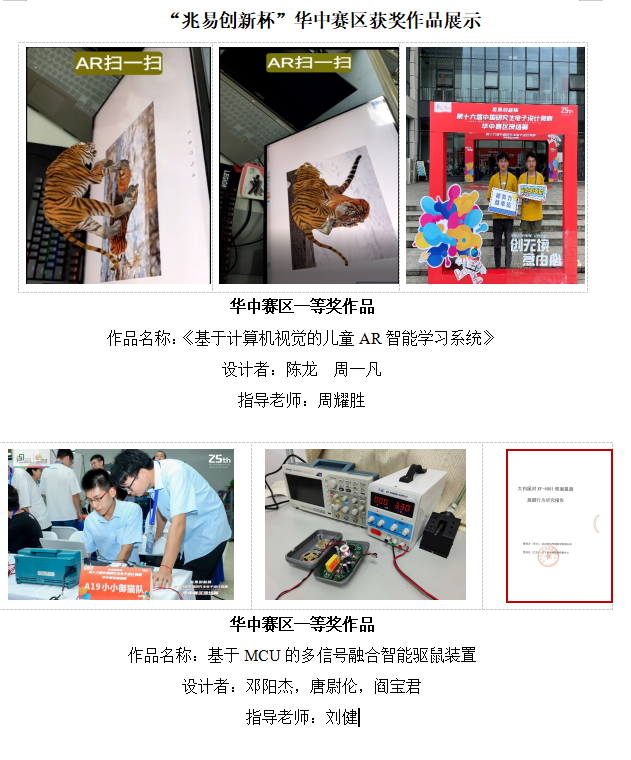 近日,“兆易创新杯”第十六届中国研究生电子设计竞赛华中赛区评审会在中南大学举行。华中地区来自武汉大学、华中科技大学、湖南大学、国防科技大学、中南大学等42所高校的551支参赛队伍报名参加,参与研究生1653人。经过专家组对参赛作品的技术文档和演示视频进行了会议评审,109支队伍从中脱颖而出,进入现场比赛。我校3支队伍斩获“华中赛区一等奖”2项,“华中赛区三等奖”1项。
