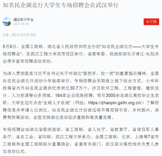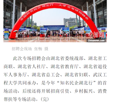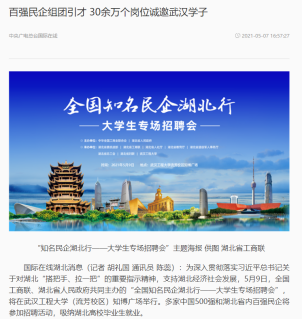 此次专场招聘会是今年“知名民企湖北行”的首场活动,小米科技、富通集团、海亮集团、天能控股、宁德时代、美团、泰康养老、九州通等41家中国民营500强企业参加招聘会,永鼎集团、福耀玻璃、格林美新材料等27家中国民营制造业500强企业现场广求“千里马”,吸引了武汉大学、华中科技大学等省内40余所高校累计3000余人参加,后续还将开展招商引资、乡村振兴、消费帮扶等专场活动,全面支持湖北经济重振和高质量发展。