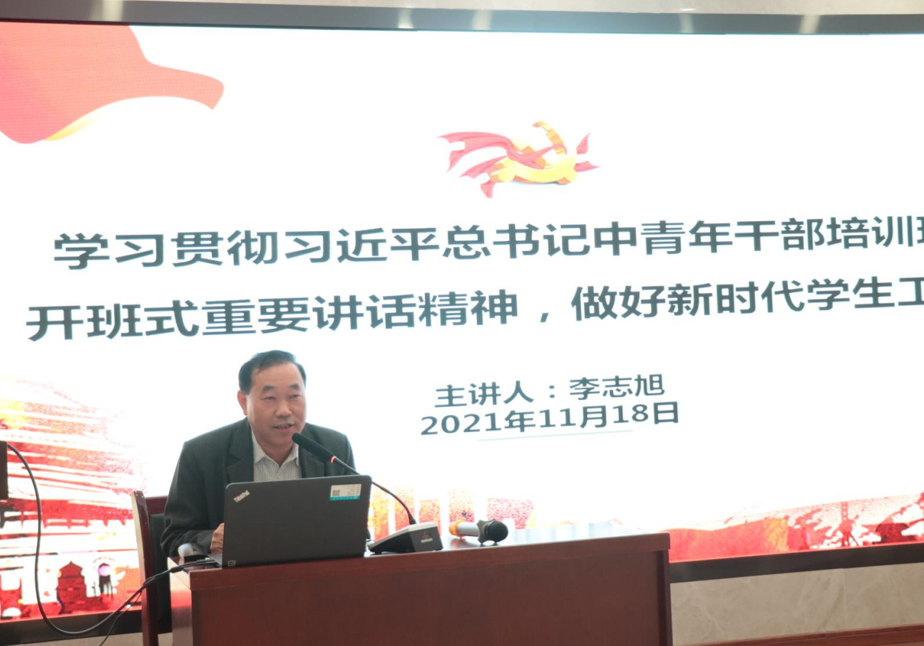 本网讯(通讯员 郑睿)根据2021年度学生政工干部培训班教学计划安排,11月18日下午,在化工大楼610会议室,校党委副书记李志旭为全体学生政工干部作了题为《学习习近平总书记在中青班开班式上重要讲话精神 努力做好新时代学生工作》的辅导报告。党委学工部、研工部、校团委全体工作人员,各学院全体专职辅导员参加了报告会。