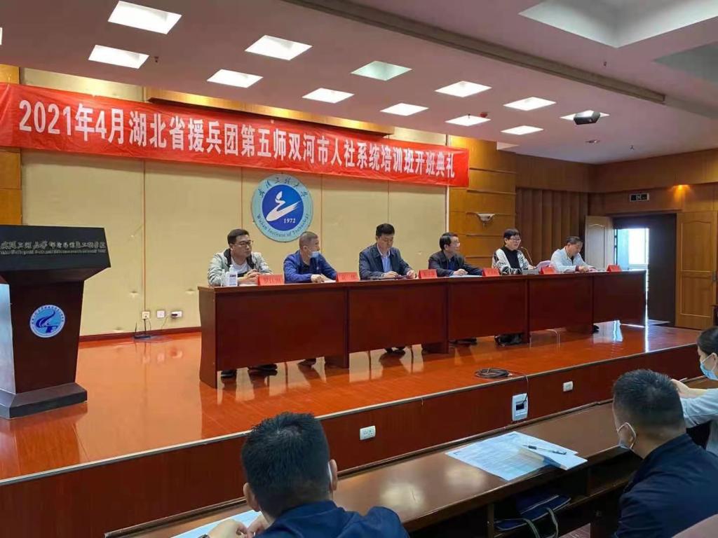 交流会前学校在武昌校区多功能报告厅举行了湖北省援新疆生产建设兵团第五师双河市人社系统干部培训班开班仪式。新疆生产建设兵团第五师双河市委组织部副部长、人力资源和社会保障局局长王呆柱,湖北省人力资源和社会保障厅人力资源流动管理处副处长朱学华,继续教育学院党总支书记吴咏梅,新疆第五师双河市公共就业和人才服务局副局长袁伟,疆楚培训中心负责人罗江恒以及相关老师,本期37名培训学员共同出席了开班典礼。开班仪式由继续教育学院副院长李正新主持。(审稿 吴咏梅)