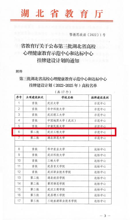 本网讯(通讯员 雷辉)近日,湖北省教育厅公布了第三批湖北省高校心理健康教育示范中心和达标中心挂牌建设计划(鄂教思政函〔2022〕1号),我校正式获批为湖北省高校心理健康教育示范中心。