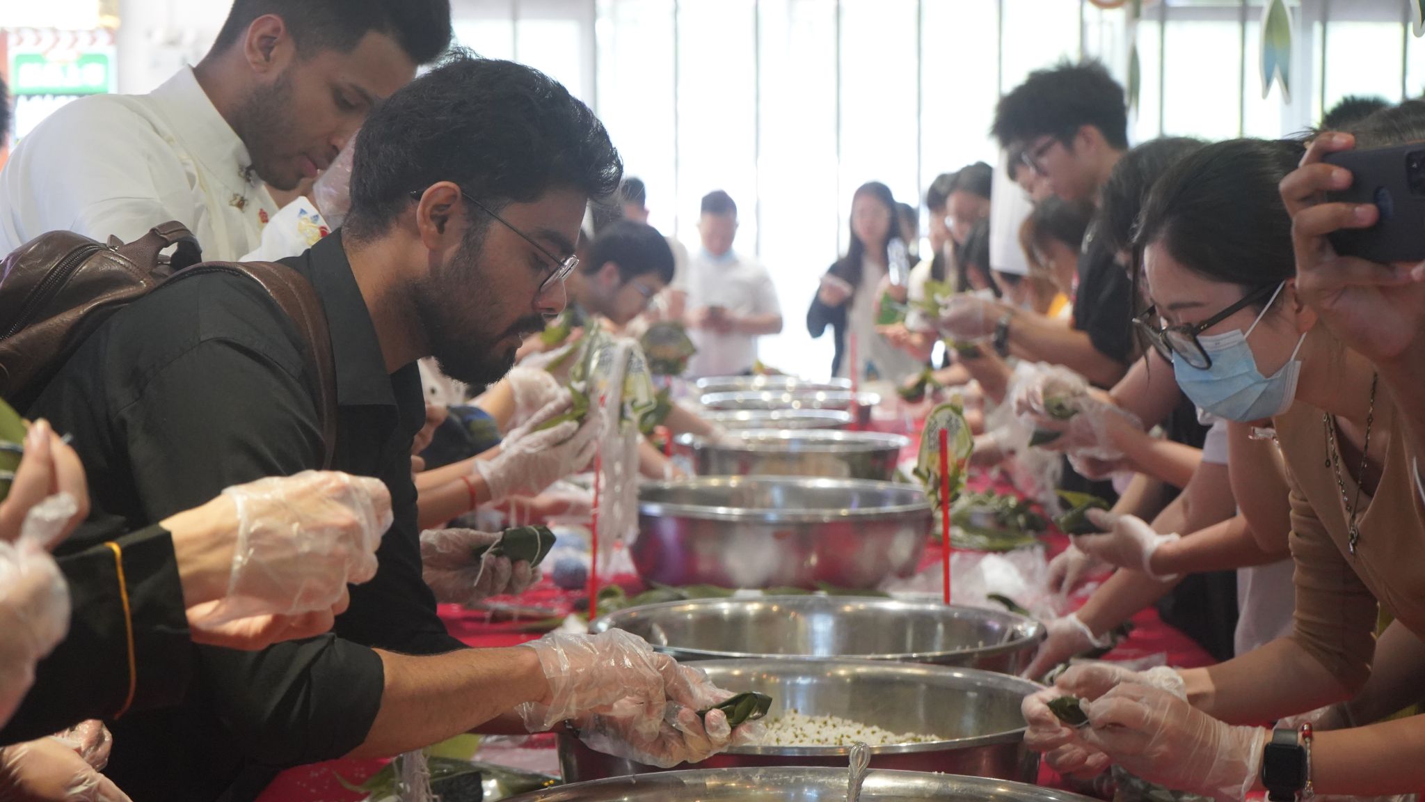 在食堂包粽子体验区、香囊制作体验区、艾草花束体验区,师生们一起动手,沉浸式体验劳动之美。
