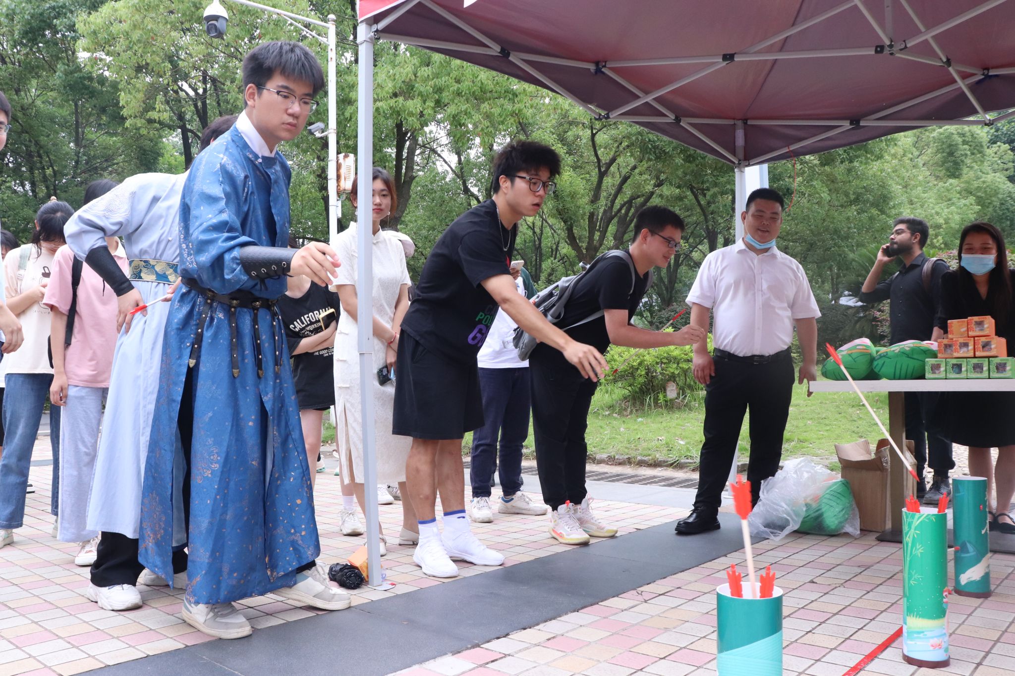 本次活动还设置了传统民俗体验区,投壶、射五毒、绘制漆扇等传统活动,让同学们在闯关娱乐中,深入了解端午节的文化内涵。