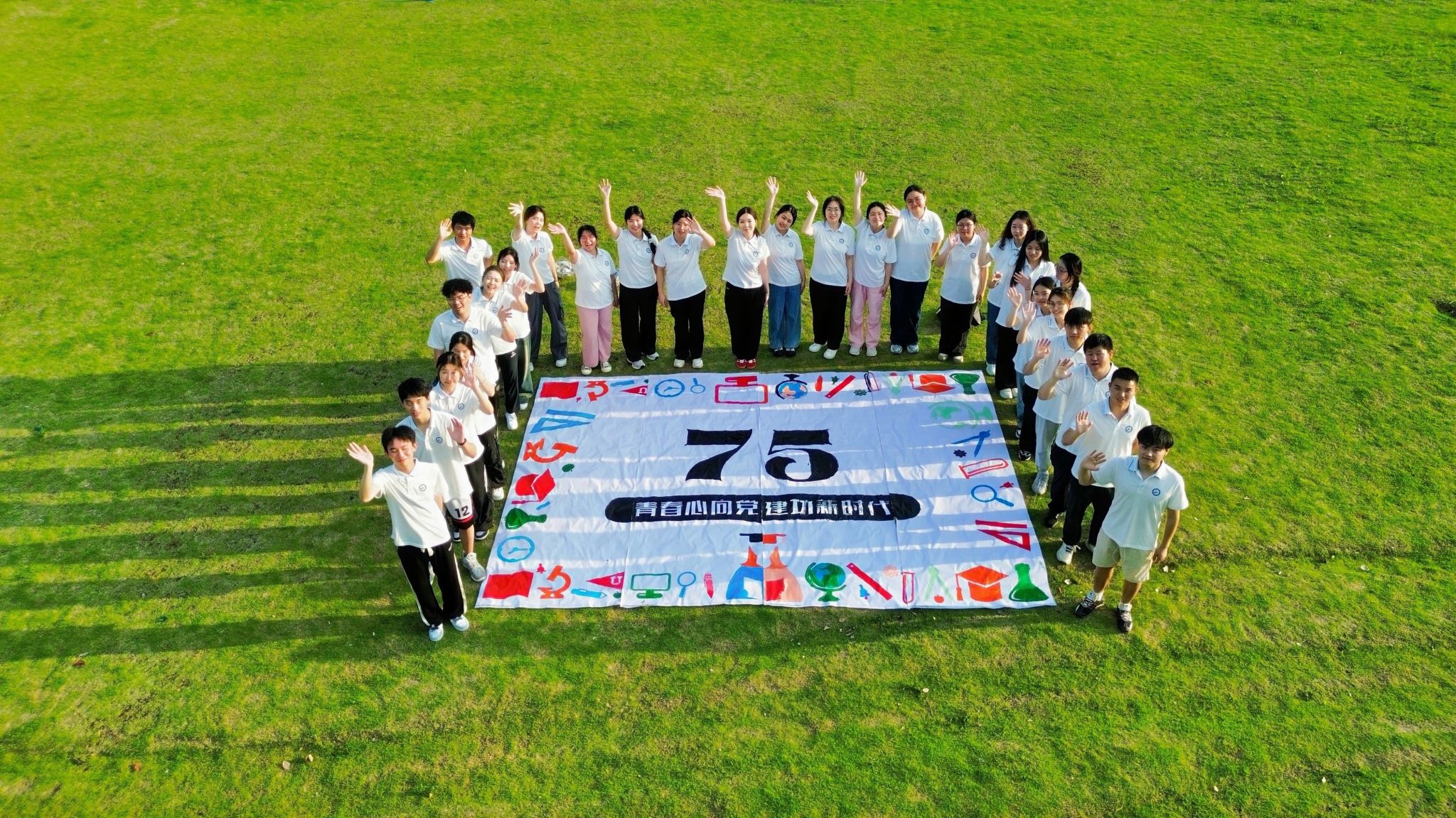 游戏后,师生们现场共同创作了一幅巨型画作,共同庆祝新中国成立75周年。画幅中央位置,数字“75”熠熠生辉,象征着新中国成立75年来的辉煌成就和不断前进的步伐,数字周围由来自各位同学所学学科的图标环绕,每一个图标都代表着一个学术领域。这幅作品表达了同学们利用所学知识和技能服务于国家、奉献于社会的坚定决心,也表达工大师生对祖国母亲最深切的祝福与敬意。“学校给予了我们丰富的知识和深厚的文化底蕴,正是这些知识的滋养,让我们拥有了反哺社会的能力,也让我们明白了一个人对祖国的爱是多么诚挚。”湖北省学联驻会执行主席、校研究生会主席团成员阮甫文谈道。