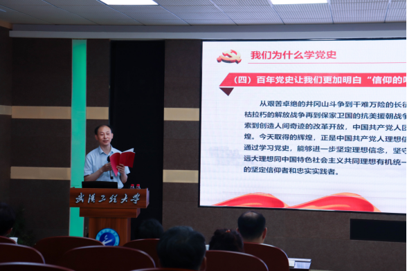本网讯(通讯员 谭明武)6月18日上午,校“党的创新理论”宣讲团第八组、副校长喻发全在文科楼315报告厅为国际学院、图书馆、体育部、继续教育学院、资源与安全工程学院(兴发矿业学院)、外语学院等六个单位师生党员代表作党史学习教育专题宣讲报告。