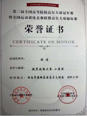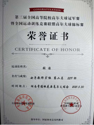 本网讯(通讯员 汪涵)5月24日---5月31日由全国运动训练竞赛联盟、全国体育职业教育教学指导委员会主办的“第三届全国高等院校高尔夫球冠军赛暨全国运动训练竞赛联盟高尔夫球锦标赛”在湖南常德桃花源国际高尔夫球场举行。我校体育部张洁教授代表学校参加了本次比赛,经过三天三轮比赛,张洁教授克服风雨多变天气,顽强拼搏、沉着冷静打好每一个球,最终获得本次比赛女子个人比杆赛第二名及教学技能大赛二等奖。本次比赛云集了全国高校的高尔夫球运动精英,有北京农业大学、深圳大学、东南大学、上海体育学院等三十多所高等院校近三百名教师、学生运动员参加。比赛分教师男女组和学生男女组个人比杆赛及教学技能大赛。