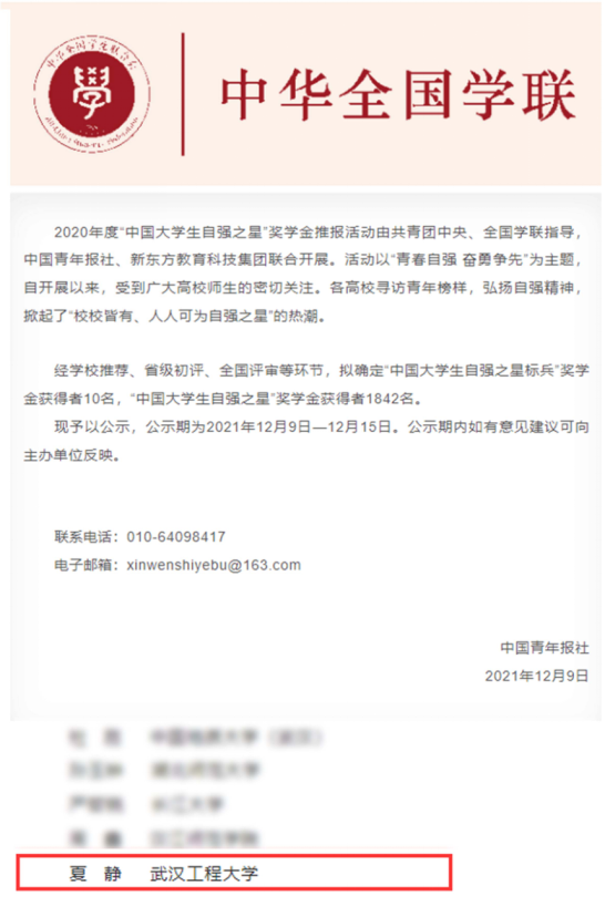 本网讯(通讯员 肖豪 汤雁钦)近日,2020年度“中国大学生自强之星”评选活动结果揭晓。经学校推荐、省级初评、全国评审等环节,我校环境生态与生物工程学院2020级博士研究生夏静与湖北省其他高校的另外72名大学生荣获“中国大学生自强之星”称号。