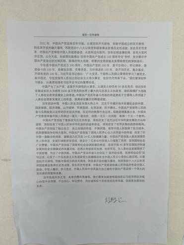 这次作品展中,来自吉尔吉斯斯坦的留学生阿米尔专门写了一篇《建党一百年感悟》为中国共产党献礼。他提到,中国共产党的诞生是中国开天辟地的大事件,中国共产党百年奋斗创造的奇迹在于它领导人民创造了人类社会国家发展史上的奇迹,取得了举世瞩目的辉煌成就,为人类社会发展提供了中国智慧,作出了中国贡献。