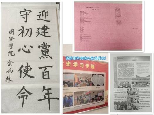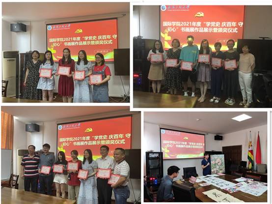 本网讯(通讯员 陈小红)为扎实开展党史学习教育,聆听党的初心,回顾百年峥嵘岁月,充分展示广大党员师生的良好精神风貌,真实反应师生队伍积极进取、担当作为、奋勇争先的责任担当和崇高情怀,国际学院开展了以“学党史 庆百年 守初心”为主题的党史学习教育作品征集活动,并于7月1日成功举办了作品展示暨颁奖仪式。