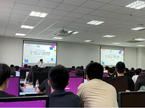 本次比赛有来自省内外高校的100余支队伍同场竞技。每队三位选手需要历时5个小时共同解答11道全英文算法设计类题目。在比赛过程中,现场大屏幕实时公布所有队伍的进展情况,每支队伍可以随时了解到身边其他参赛队伍的答题情况,极大考验参赛选手的现场抗压能力。