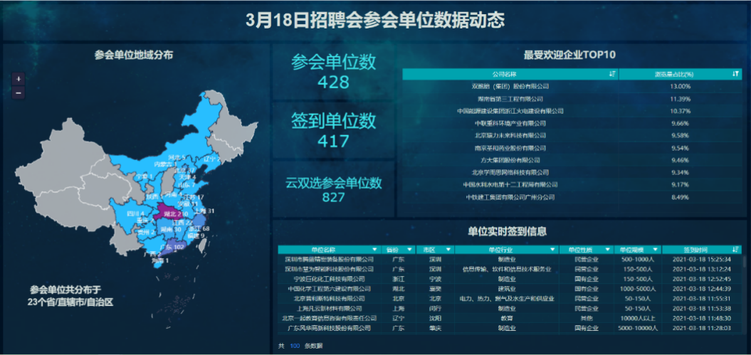 在供需见面会入场处的电子显示屏上,实时展示尊龙凯时人生就是博智慧就业大数据平台。通过大数据采集,实时显示本场供需见面会的参会单位数据动态、参会学生求职动态和签约动态。截止到中午12点,本场供需见面会网上点击量达4万余次,参会学生4137人。