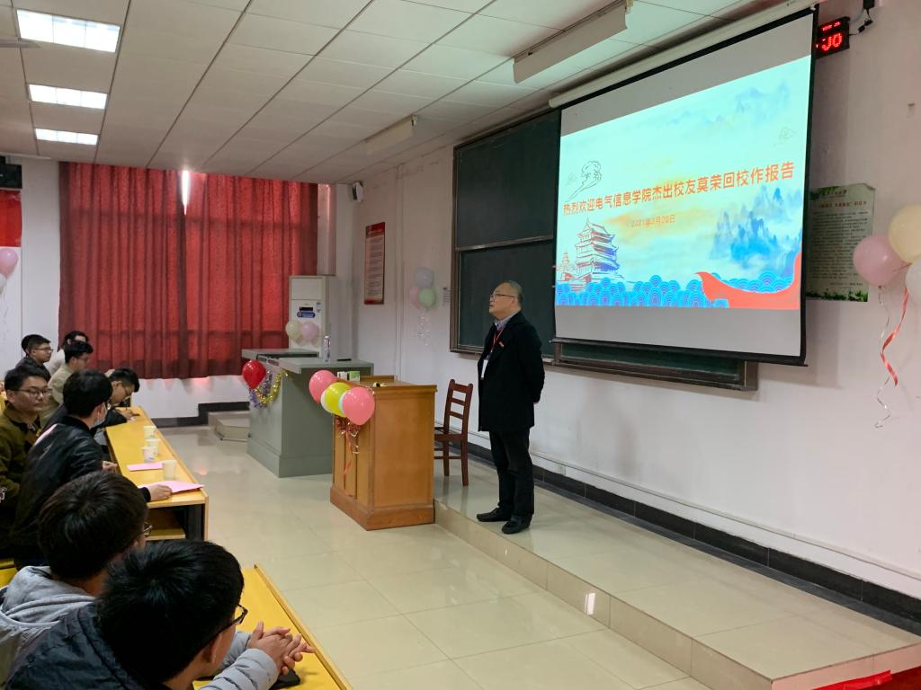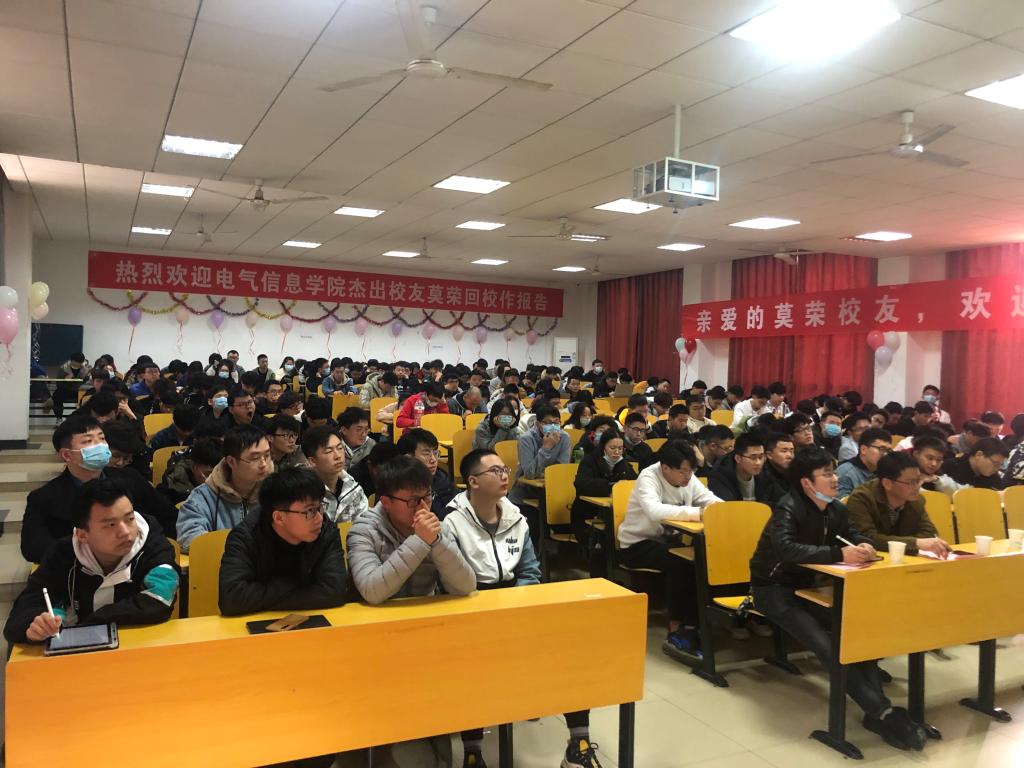 本网讯(通讯员 周磊)3月20日下午,我校杰出校友莫荣做客电气信息信息学院“思源.引路人”校友论坛。莫荣为我校87级原自动化系(现电气信息学院)校友,现为深圳市福赛特实业有限公司、深圳市摩控自动化设备有限公司、深圳工大联合股份有限公司董事长,尊龙凯时人生就是博校友会副会长、深圳校友会会长。莫荣董事长为电气信息学院200余名学子作了以“梦怀理想,用心翱翔”为主题的演讲报告,报告会由电气信息学院党委副书记桂展鹏主持。