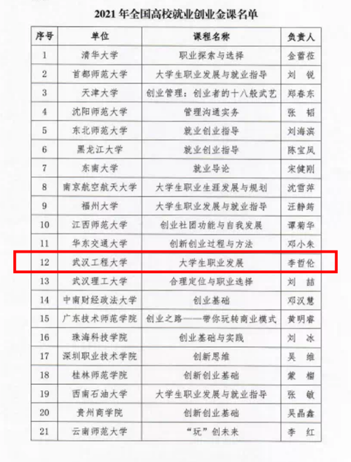 本网讯(通讯员 李哲伦 马瑜)近日,教育部全国高等学校学生信息咨询与就业指导中心发布了《关于加强2021年全国高校就业创业金课建设工作的通知》。通知公布了21门全国高校就业创业金课名单。我校“大学生职业发展”课程成功入选,是湖北省入选的3门课程之一。