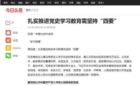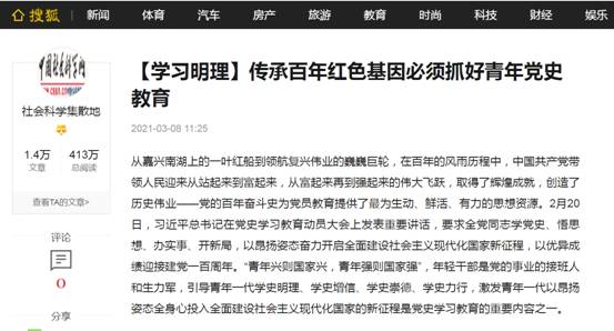 本网讯(通讯员 金诗灿)中共中央决定开展党史学习教育主题活动以来,我校马克思主义学院迅速响应党中央号召,按照学校部署,积极组织教师开展党史学习教育专题活动,组织教师撰写文章,深入研究党史及如何开展党史教育,在《中国社会科学网》等多家主流网站发表文章。操菊华教授撰写了《传承百年红色基因必须抓好青年党史教育》(http://ex.cssn.cn/zx/bwyc/202103/t20210308_5316182.shtml),陈永贵博士撰写了《扎实推进党史学习教育需坚持“四要”》(http://ex.cssn.cn/zx/bwyc/202104/t20210413_5325923.shtml)。文章发表后,被搜狐、网易、中国历史研究网及今日头条等客户端转发,产生了积极影响。