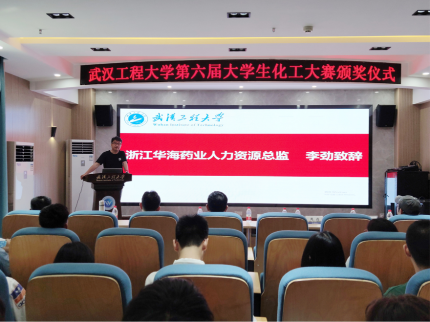 浙江华海药业人力资源总监李劲,化工与制药学院院长汪铁林,副院长金放、闫志国,创新创业中心主任杜志平,化工原理中心主任覃远航,指导教师李萍、唐正姣参加活动。颁奖典礼由化工与制药学院党委副书记周丹主持。