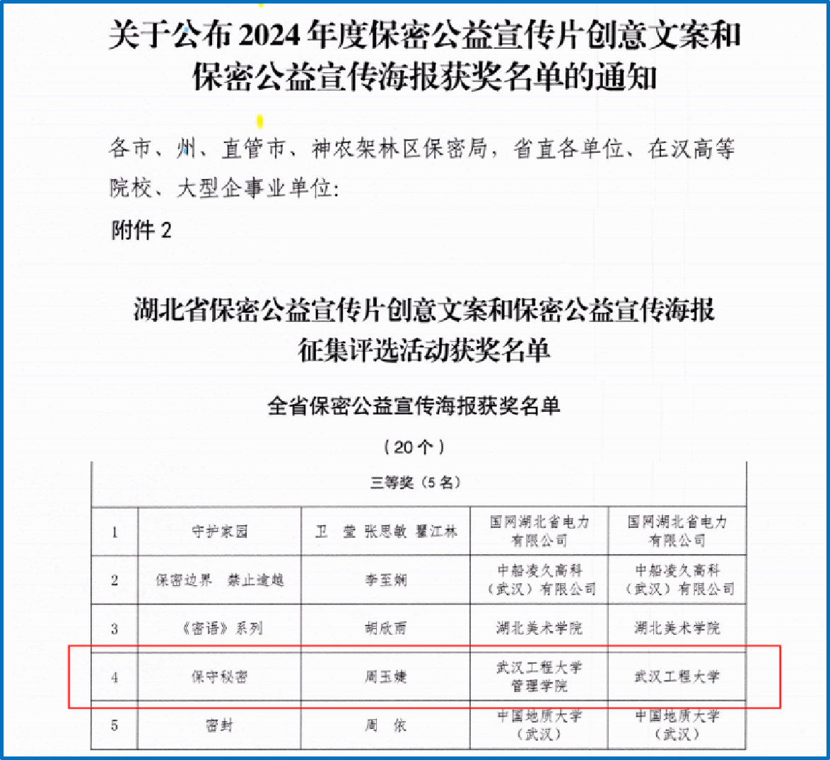 本网讯(通讯员 沈霁月)近日,湖北省国家保密局办公室印发《关于公布2024年度保密公益宣传片创意文案和保密公益宣传海报获奖名单的通知》,从全省各地各部门报送464部创意文案、宣传海报中,评选出40部获奖作品。我校选送作品《保守秘密》荣获全省保密公益宣传海报类三等奖。