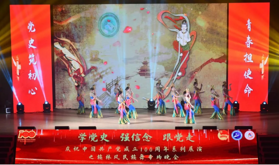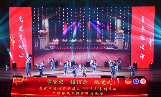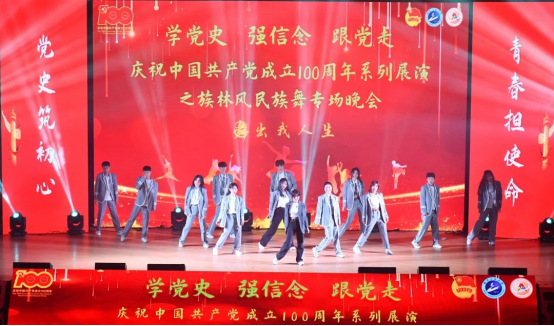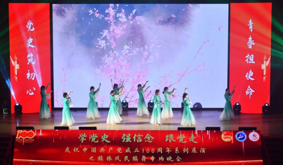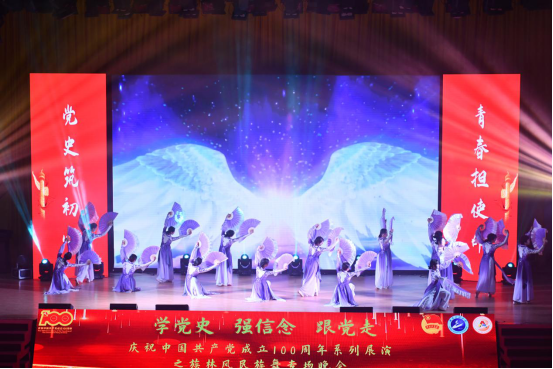 本网讯(通讯员 张钟文)为庆祝建党100周年,丰富学生的课余生活,进一步推动校园文化建设,营造良好的艺术氛围,5月7日晚,学校庆祝中国共产党成立100周年系列展演之族林风民族舞专场晚会在流芳校区大礼堂成功举行。