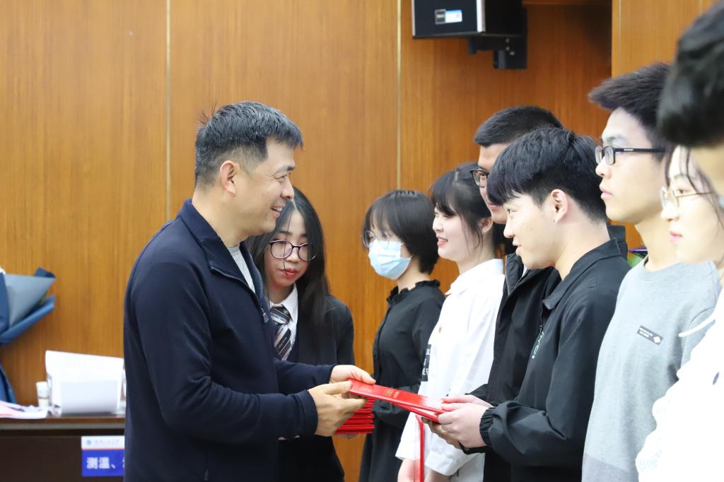 会上,校友工作处处长、基金会秘书长邓新洲宣读了2020—2021学年度“胡玉生”奖助学金获奖名单,25名在校生每人获得4000元奖助学金。胡玉生校友亲自为获奖学生颁奖,并接受学生代表献礼。来自化工与制药学院2017级的陈金辉同学作为获奖学生代表表达了对学校和胡玉生先生的感恩之情,表示要将把这份爱心当作今后不竭的动力,努力学习,积极进取,争做新时代的追梦人,在奋斗中贡献青春力量、展示青春风采。