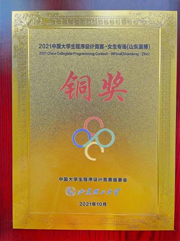 本网讯(通讯员 余朝波 陈灯)近日,2021年中国大学生程序设计竞赛女生专场在山东理工大学圆满落幕。计算机科学与工程学院人工智能学院刘宣萱、徐瑾怡、光电信息与能源工程学院数理学院杨佳琪同学组成的“卷积神经网络”队在计算机科学与工程学院人工智能学院刘玮、陈灯老师的指导下勇夺铜奖。
