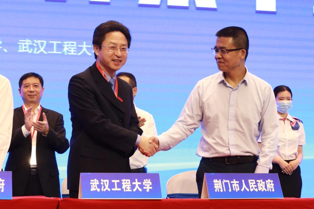 副校长张彦铎与荆门市副市长门金勇签订了《战略合作框架协议》;副校长张彦铎与荆门市副市长李文震签订了《共建化工新材料产业技术研究院协议》。