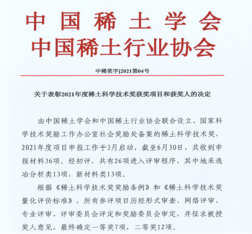 2021年度稀土科学技术奖共表彰19项,其中一等奖7项,二等奖12项。该奖项是由中国稀土学会和中国稀土行业协会联合设立、国家科学技术奖励工作办公室社会奖励处备案,旨在奖励在稀土科学技术领域做出突出贡献的单位和个人,调动稀土相关领域科技工作者的积极性和创造性,推动我国稀土科学技术的创新发展。