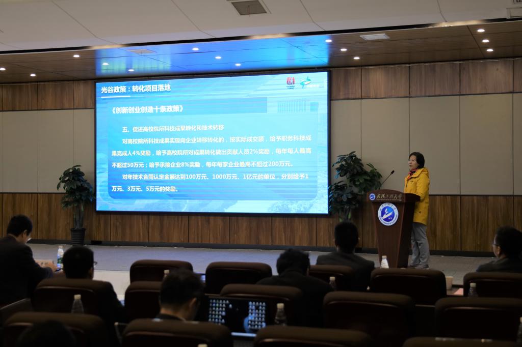吴世英解读了东湖高新区科技成果转化最新政策,从“创新创业创造十条政策”、“四个有奖”等角度对促进高校院所科技成果转化和技术转移、培育引导优质高端创业项目落地发展、加强科技成果转化市场服务能力建设等方面进行了介绍,期待我校更多科技成果落户东湖高新区。