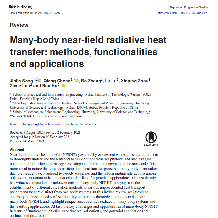 Jinlin Song, Qiang Cheng, Bo Zhang, Lu Lu, Xinping Zhou, Zixue Luo and Run Hu, Many-body near-field radiative heat transfer: methods, functionalities and applications, Reports on progress in physics 2021, 84(3): 36501