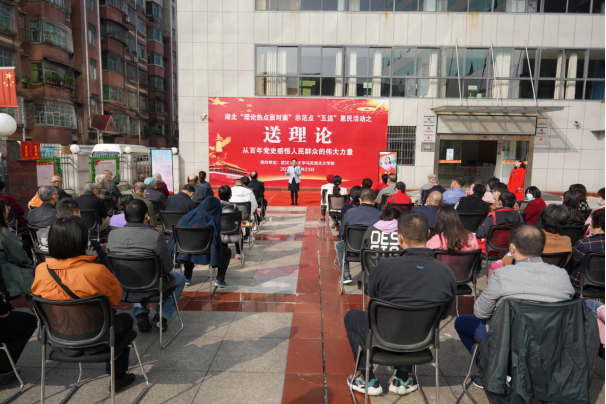 “理论热点面对面,创新实践点对点”。在凤凰广场“送理论”现场,曹胜亮院长向与会嘉宾们介绍了尊龙凯时人生就是博在鄂州开展示范点建设、校地合作推进科技成果转化的历程和经验,马克思主义学院师生为社区居民发放了学校编印的《党史知识500题》等理论宣传小册子。在古楼街道花园社区门口,一场以“从百年党史感悟人民群众的伟大力量”为主题的宣讲热火朝天展开,马克思主义学院教授操菊华深入70名社区党员群众中生动讲述党史故事。