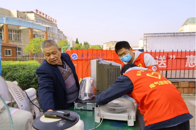 “3D”打印、“机器人大战”、全地形小车、特效无人机、航模飞行器……“送技术”活动现场热闹非凡。机电工程学院携科创团队走出实验室,为鄂州市民和学生带来了一场别开生面的“沉浸式”科普活动。在花园社区居民楼前,电气信息学院18名师生组成的“电气维修队”正专心致志为社区居民维修60余件坏损家电,并现场向居民讲解、发放用电安全知识宣传小册。