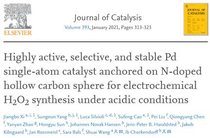 本网讯(通讯员 陈俊)2021年1月,催化领域顶级期刊《Journalof Catalysis》(一区,Top期刊)刊登了我校青年教师奚江波与华中科技大学、丹麦技术大学、哥本哈根大学、塔夫茨大学、安特卫普大学、波士顿学院和韩国科学技术院等高校和科研机构合作的研究成果:《Highlyactive, selective, and stable Pd single-atom catalyst anchored on N-dopedhollow carbon sphere for electrochemical H2O2synthesisunder acidic conditions》(DOI:10.1016/j.jcat.2020.11.020)。