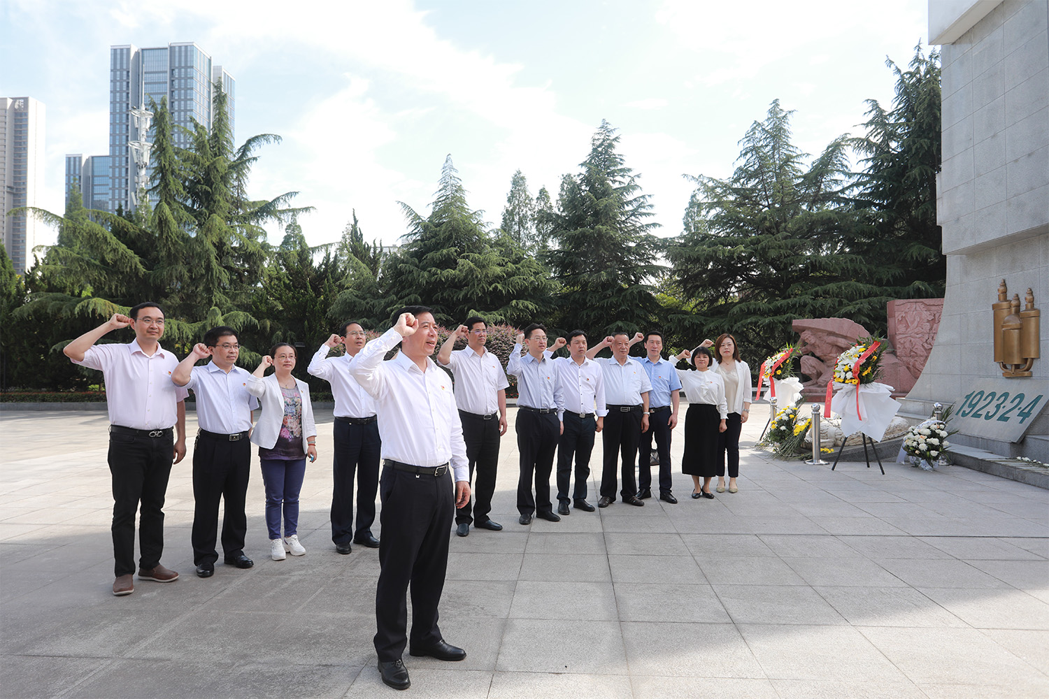 随后,全体人员瞻仰了二七烈士纪念碑。在纪念碑前,校党委书记程幼金领誓,党员干部举起右手,重温入党誓词。