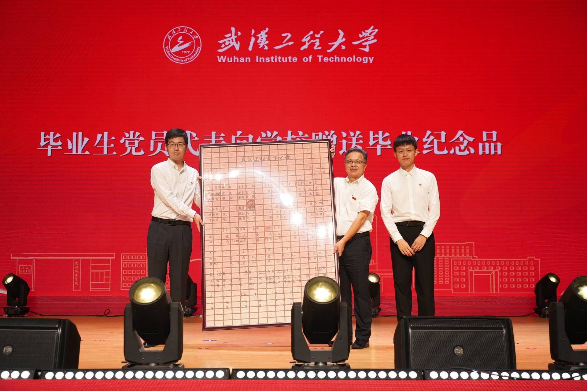 典礼上,校党委书记汪伟代表学校接受毕业研究生代表向学校赠送的毕业纪念品。