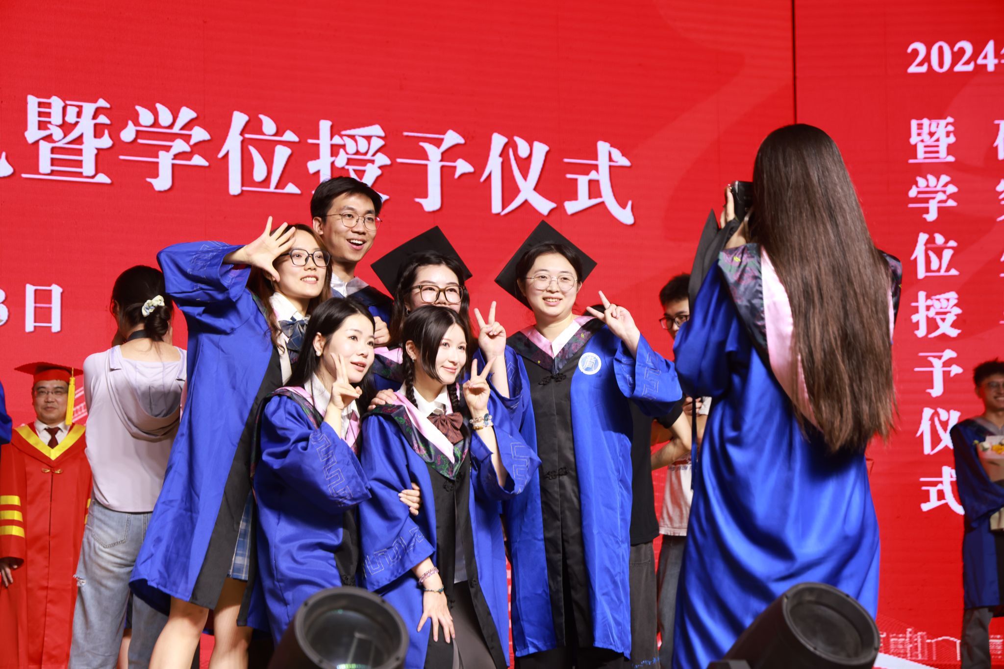 毕业典礼结束后,学校举行了隆重的学位授予仪式。副校长姚槐应宣读《关于授予2024届毕业研究生学位的决定》,授位导师为全体毕业研究生一一拨穂正冠并合影留念。
