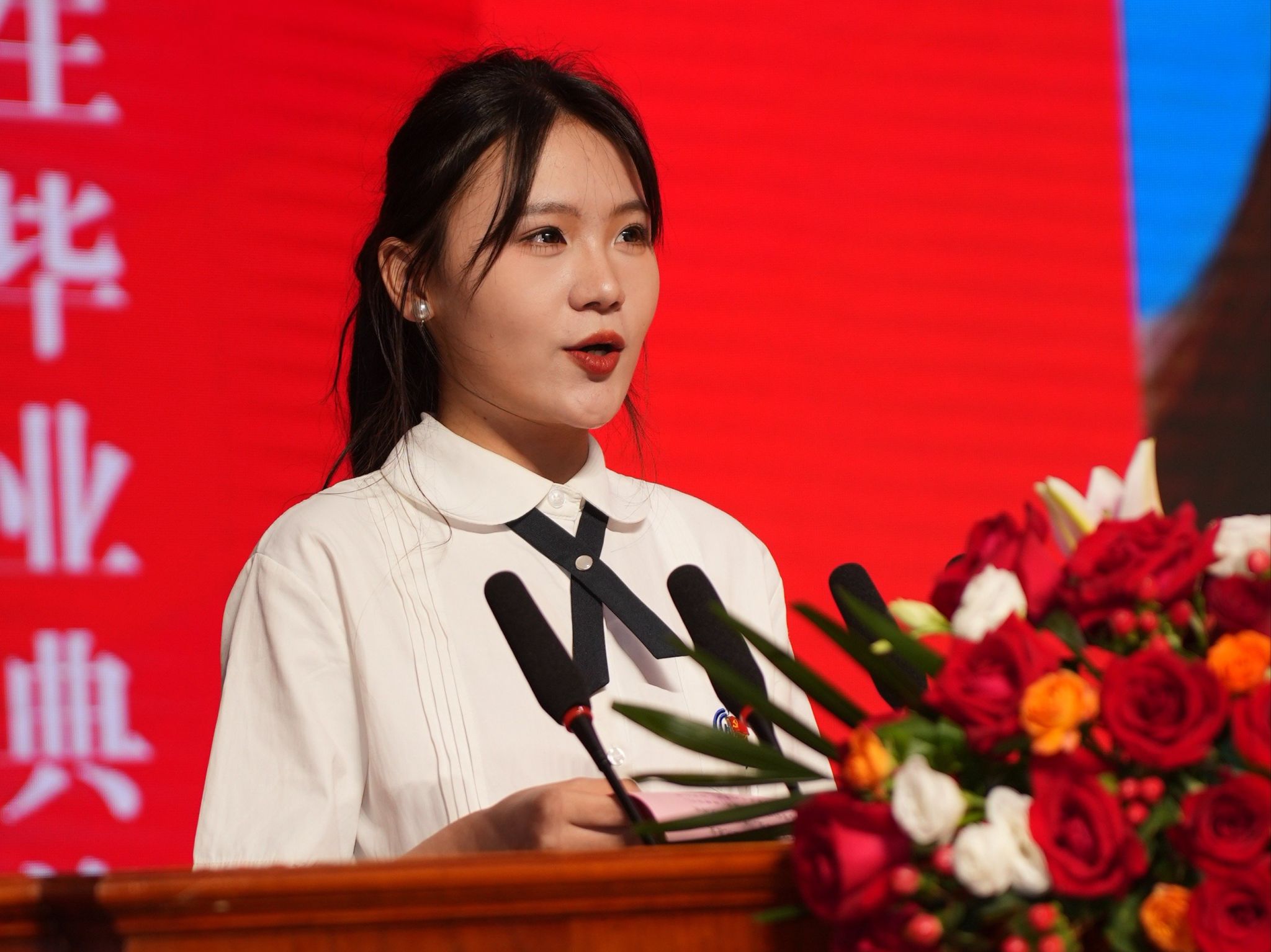 典礼开始前,师生代表用饱含深情的歌声,期待青春许过的愿望能够“一路生花”。毕业纪念短片《有我》带大家回到了三年前的那场邂逅,全体师生共同许下“强国有我、兴校有我”的誓言,现场气氛激昂澎湃。