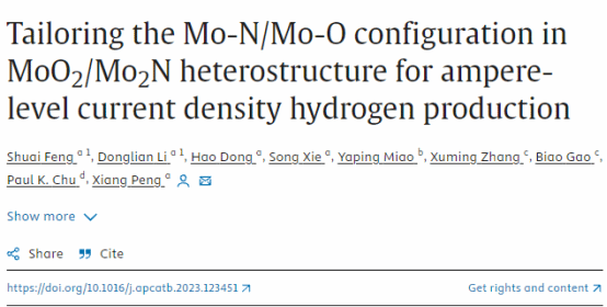 2021级研究生冯帅和2022级研究生李冬连在彭祥教授的指导下以共同一作在《Applied Catalysis B: Environmental and Energy》上发表题为“Tailoring the Mo-N/Mo-O configuration in MoO2/Mo2N heterostructrue for ampere-level current density hydrogen production”的研究文章。