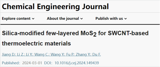 2021级研究生蒋朵在张云飞副教授的指导下以第一作者身份在《Chemical Engineering Journal》上发表题为“Silica-modified few-layered MoS2 for SWCNT-based thermoelectric materials”的研究成果。