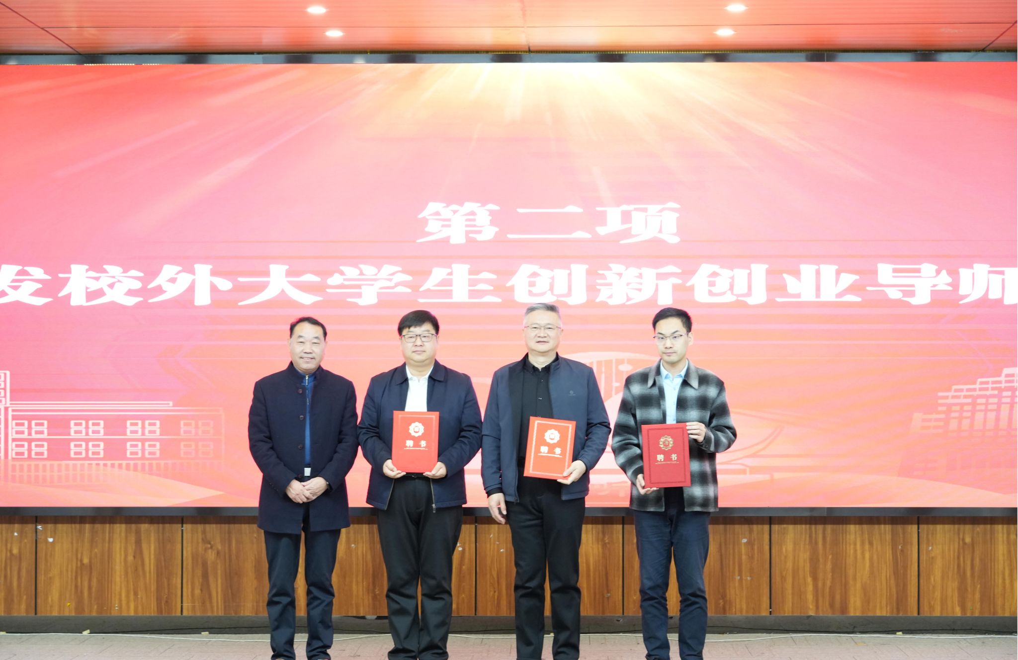 学校聘请姜仁柱、马宏飞、张豪为学校大学生创新创业校外导师,校党委副书记李志旭为三位导师颁发聘书。