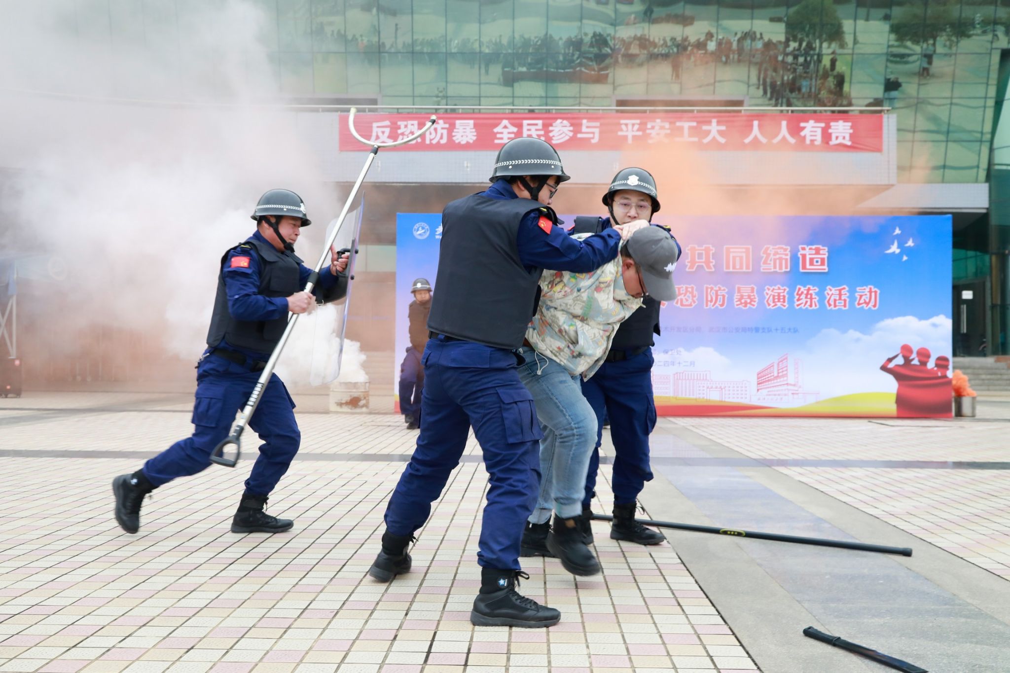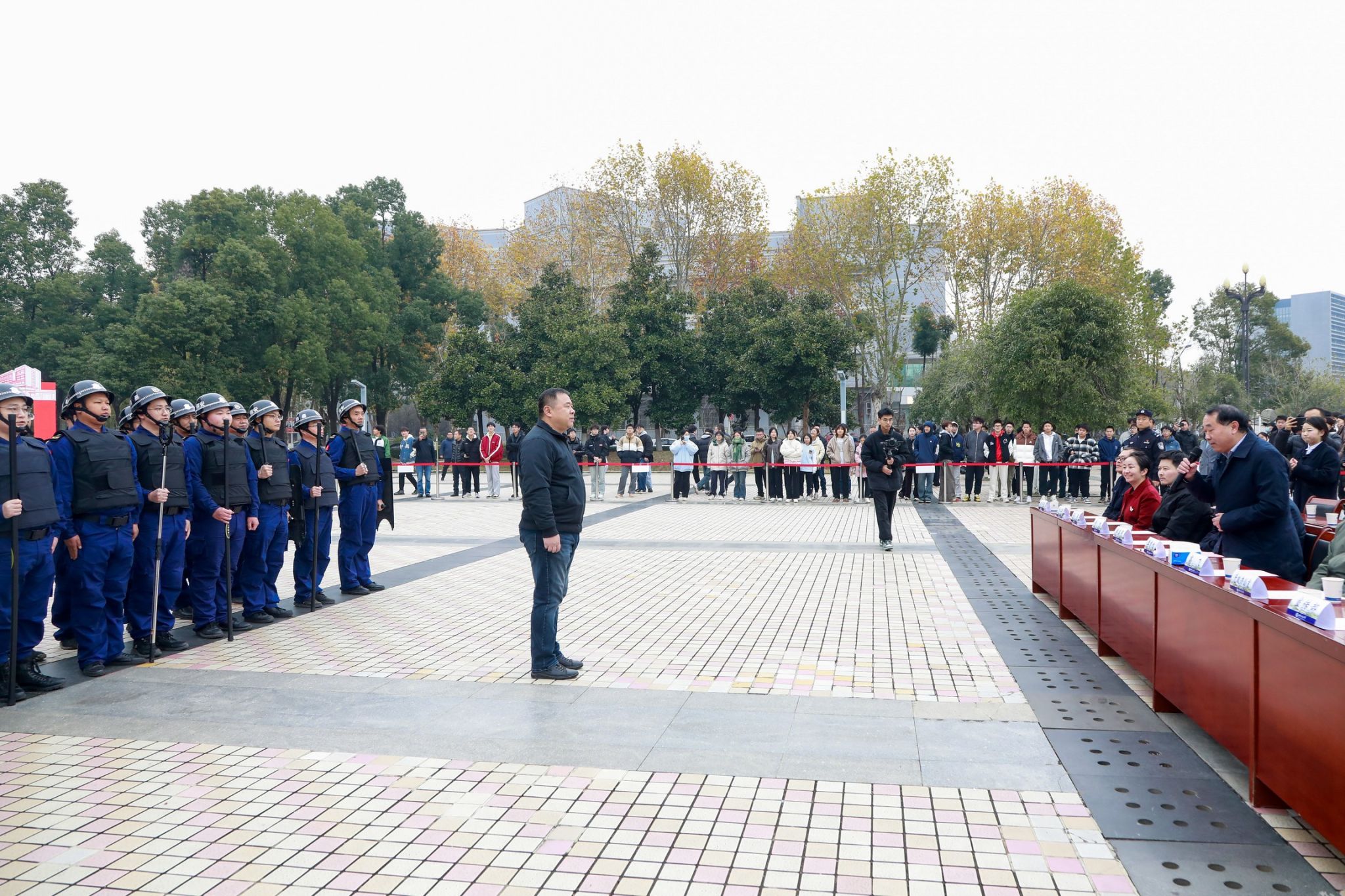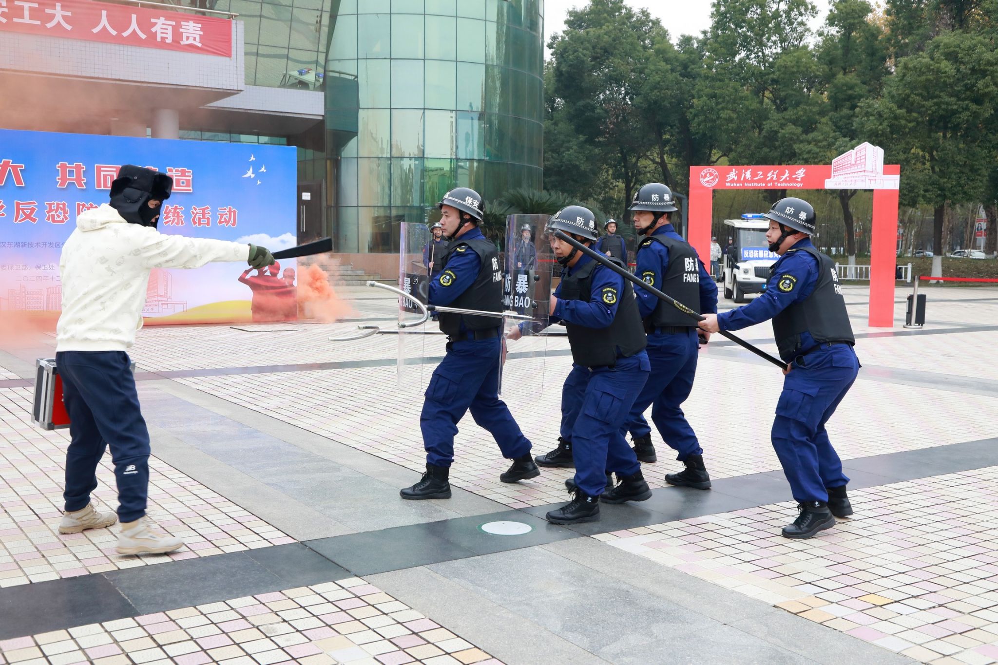 本网讯(通讯员 郭洪伟 孙利明 黄俊)为有效防范恐怖暴力突发伤害事件的发生,切实保障师生人身安全,维护校园安全稳定,12月12日下午,学校在流芳校区大礼堂广场举行反恐防暴演练活动。校党委副书记李志旭出席活动并讲话。校党委常委、宣传部部长韩高军,武汉市公安局武汉东湖新技术开发区分局反恐大队大队长高飞、副大队长孙军,武汉市公安局特警支队十五大队副大队长许凯,学校各职能部门负责人、各学院党委副书记、辅导员、全体保卫干部及学生代表等300余人参加活动。