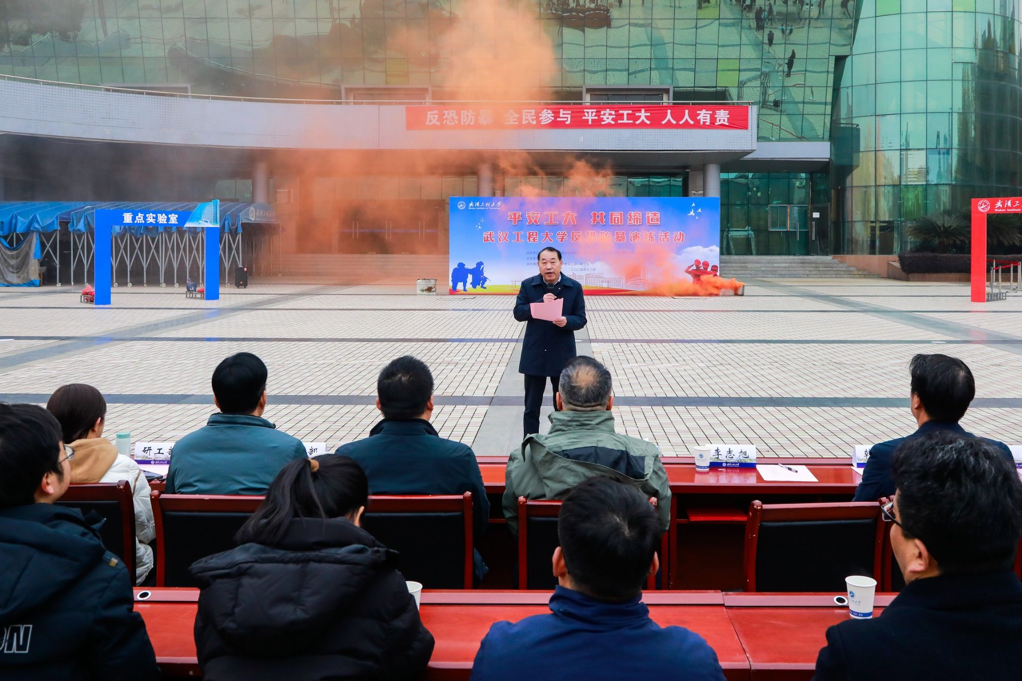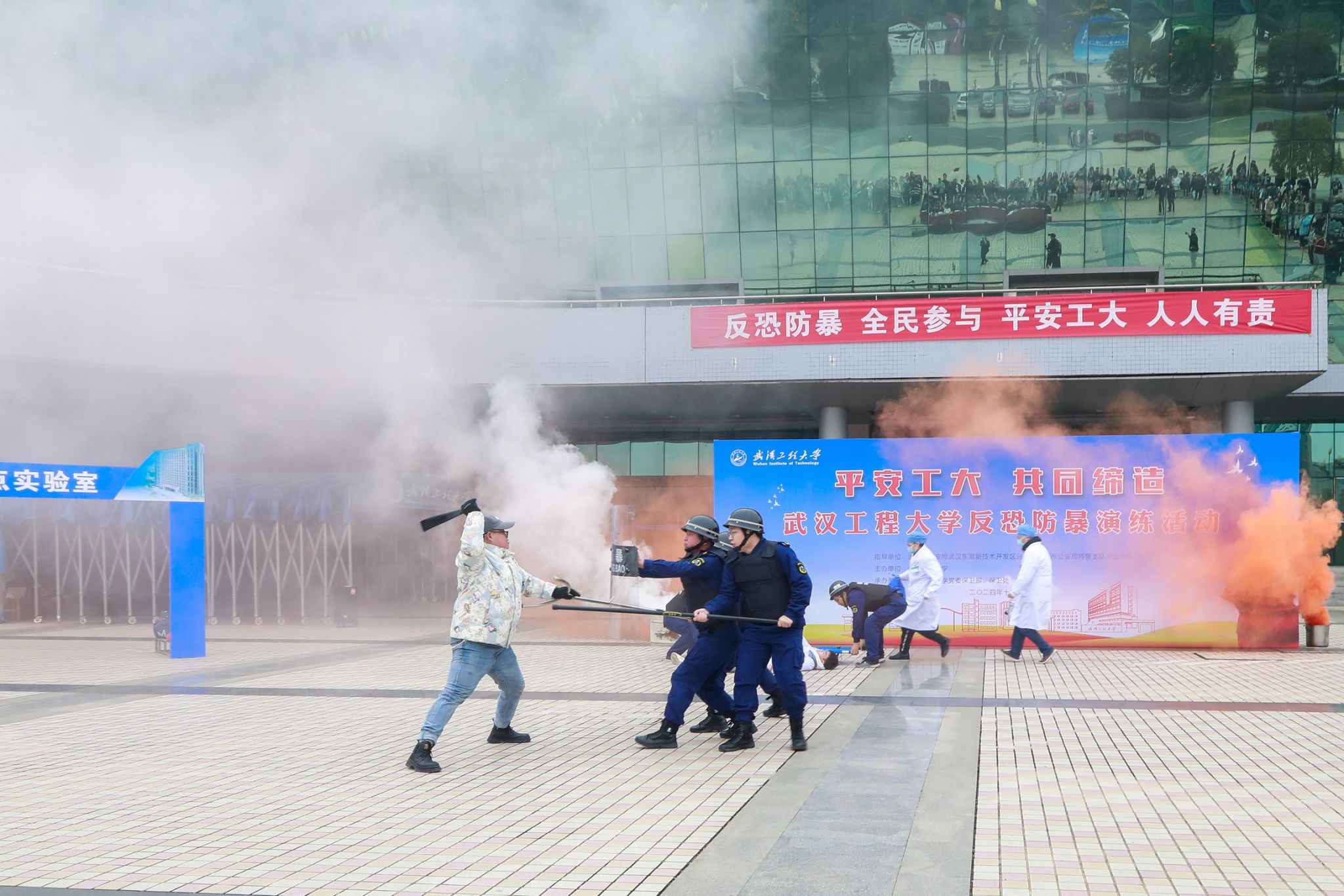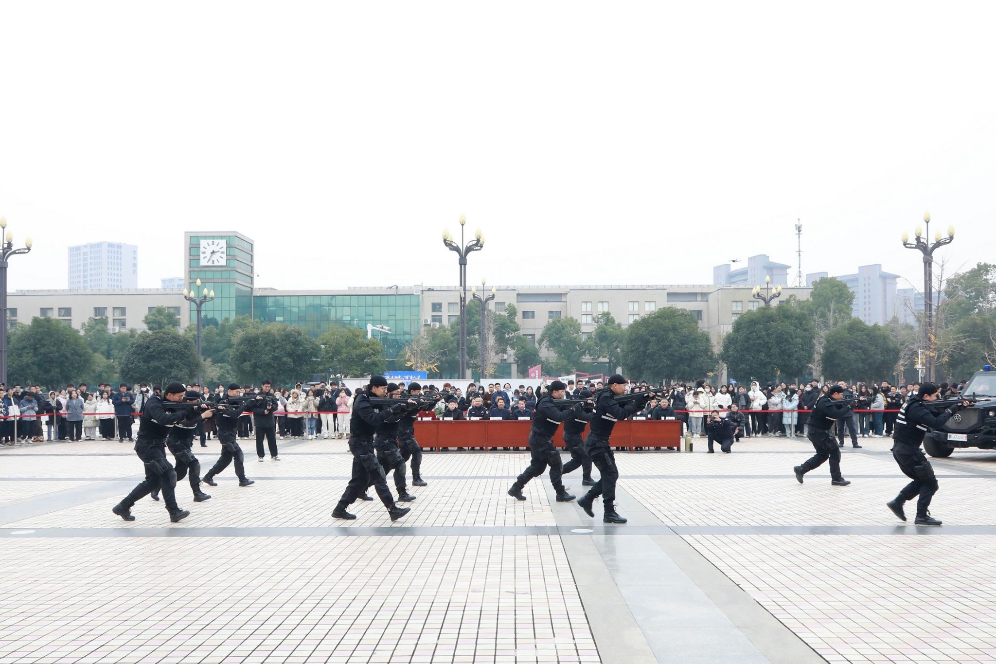 本网讯(通讯员 郭洪伟 孙利明 黄俊)为有效防范恐怖暴力突发伤害事件的发生,切实保障师生人身安全,维护校园安全稳定,12月12日下午,学校在流芳校区大礼堂广场举行反恐防暴演练活动。校党委副书记李志旭出席活动并讲话。校党委常委、宣传部部长韩高军,武汉市公安局武汉东湖新技术开发区分局反恐大队大队长高飞、副大队长孙军,武汉市公安局特警支队十五大队副大队长许凯,学校各职能部门负责人、各学院党委副书记、辅导员、全体保卫干部及学生代表等300余人参加活动。