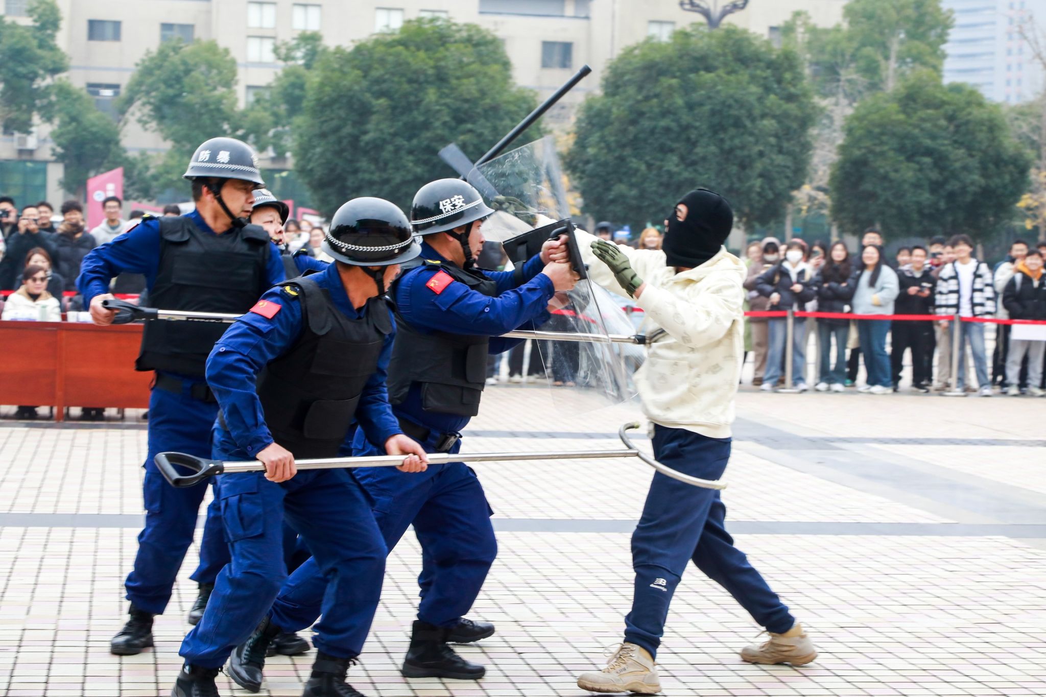 活动现场,武汉市公安局特警支队十五大队公安干警向师生展示了格斗拳和战术枪操表演。格斗拳虎虎生风、刚劲有力;战术枪操行云流水、招招制敌;特警们协作配合默契,展现了高超的专业素养。