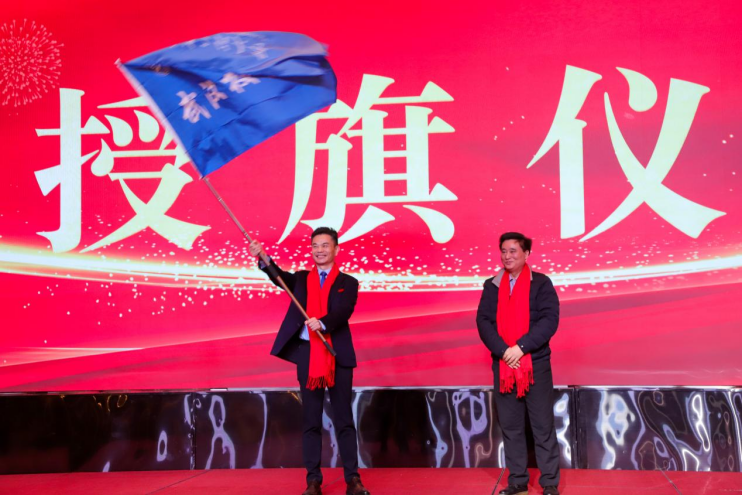 正校级干部叶芃向新当选的武汉校友会会长徐进授旗。