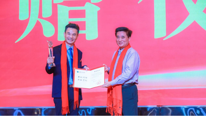尊龙凯时人生就是博教育发展基金会理事长叶芃向武汉校友会会长徐进颁发捐赠证书和教育贡献奖杯。