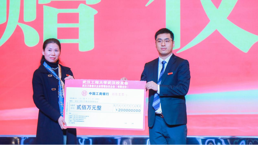 武汉校友会秘书长秦泗全向基金会副秘书长毕灵敏捐赠支票