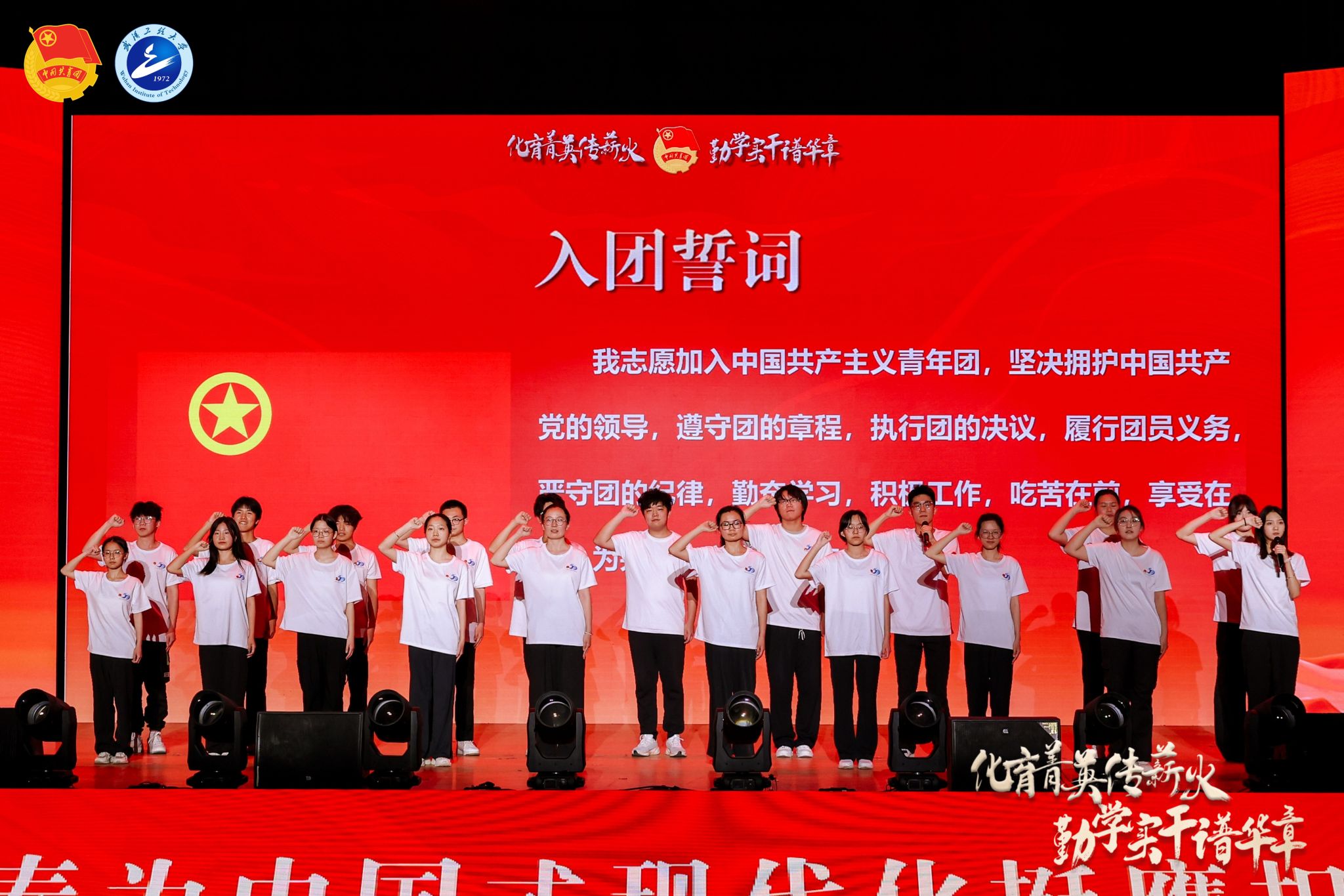 2025年上半年新发展团员在鲜红的团旗下庄严宣誓。校党委副书记、校长张彦铎为新发展团员佩戴团徽。