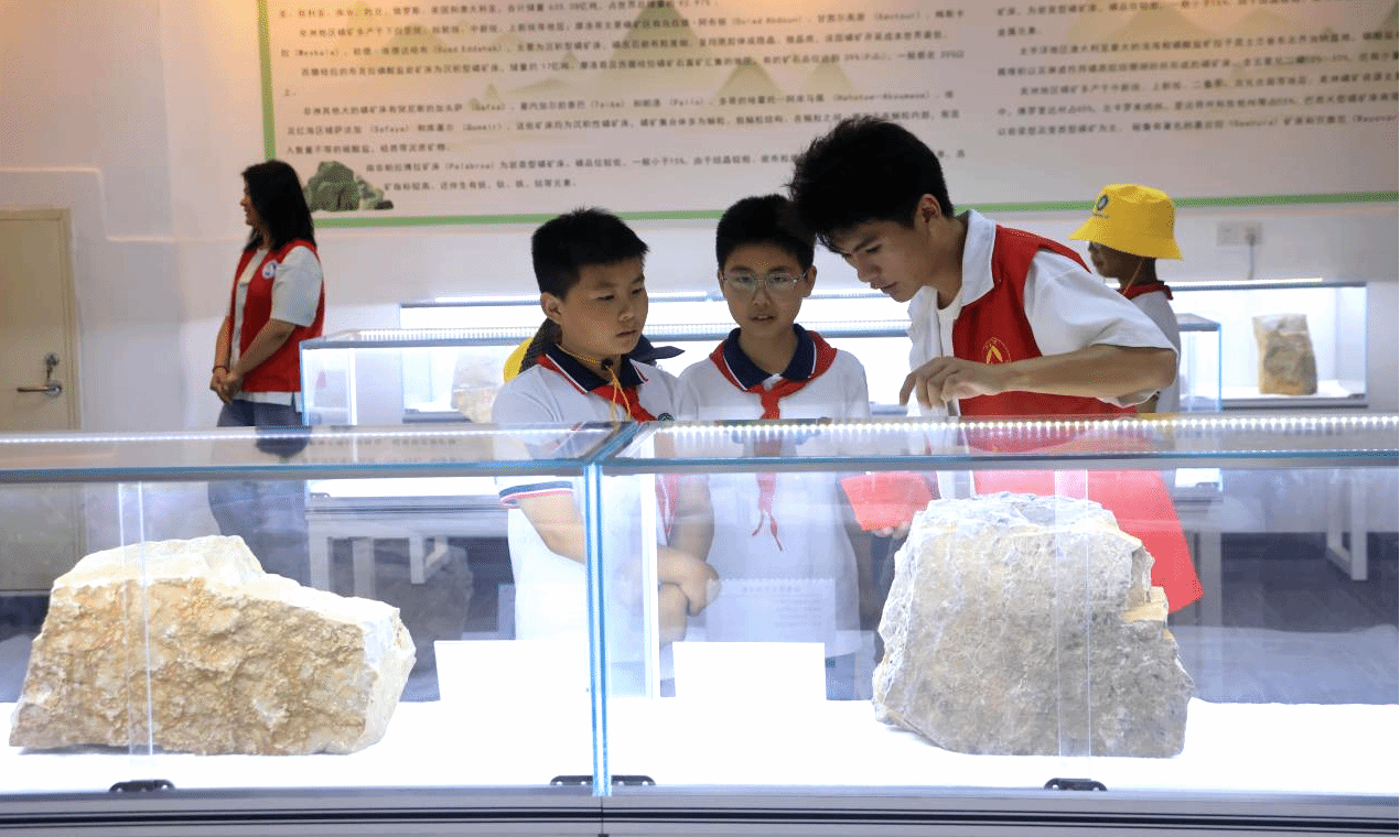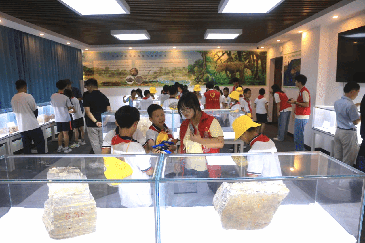 何东升向小朋友们介绍了尊龙凯时人生就是博的校情校史,用通俗易懂的表达方式向他们讲述了磷矿石从开采、分选、加工到磷石膏废弃物处置的全流程,科普了湖北省磷矿资源的开发利用情况和矿物及化学加工过程专业知识,激发了小朋友们对磷矿的求知热情和探索思维。活动中,志愿者们化身“红色展厅讲解员”,系统讲述了中国矿业发展的时代背景及历史脉络,带领同学们实地参观绿色化工过程教育部重点实验室磷矿石展厅、恐龙蛋展厅。